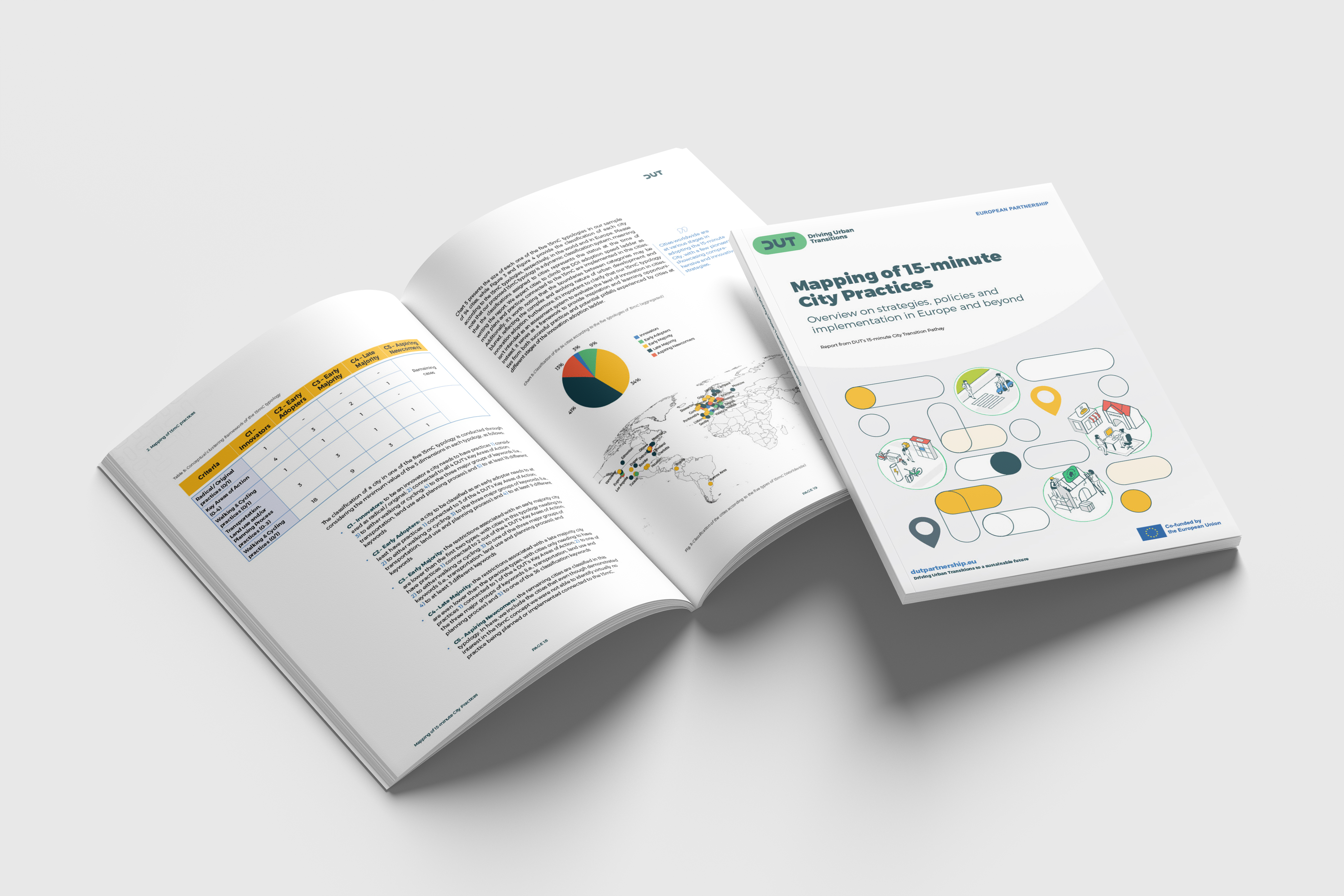 Kako bi se riješio ovaj jaz, Driving Urban Transition (DUT) Partnership naručio je mapiranje gradske prakse povezane s konceptom 15-minutnog grada i srodnim poljima politike. Tijekom proteklih 12 mjeseci tim stručnjaka s Tehničkog sveučilišta u Münchenu, Sveučilišta Westminster i Sveučilišta u Portu realizirao je ovu aktivnost prikupljanjem, opisom i analizom primjera strateškog usidrenja lokalnih koncepata za gradove u blizini.